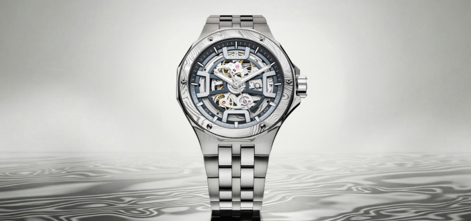 Edox Delfin Mecano Damascus Limited Edition: a bold reinterpretation in a refined 40mm case, now crowned with a forged Damascus steel bezel, each piece uniquely patterned like the waves themselves.